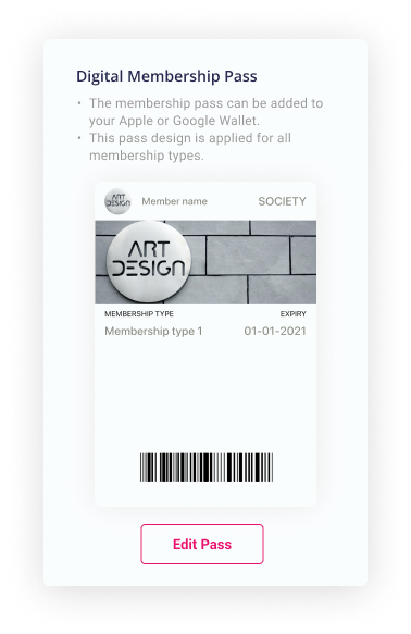 The digital membership pass is a digital version of the physical card or sticker system usually handed out to members when they sign up for your club or society.